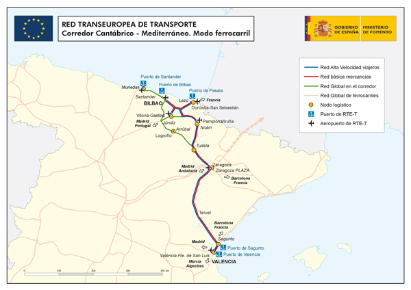 El corredor ferroviario Cantábrico-Mediterráneo conecta en la red básica para viajeros y mercancías las ciudades de Bilbao, San Sebastián, Pamplona, Zaragoza, Teruel y Valencia. Asimismo, en la red global ferroviaria se contempla el trazado de conexión de Zaragoza y las ciudades de Santander, Bilbao y San Sebastián a través de Vitoria.