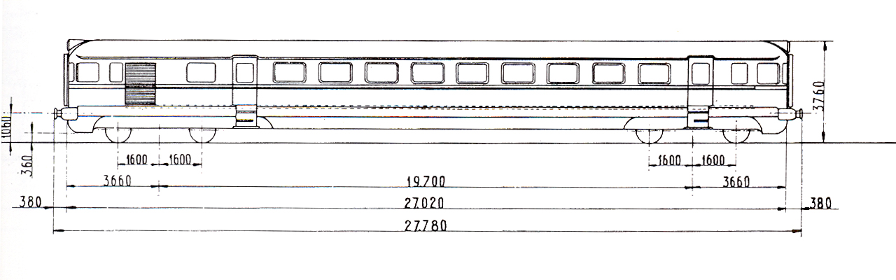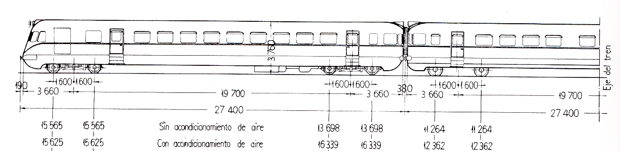 Peso total en servicio: 58.000 Kgs. Peso por eje motor: 15.000 Kgs. Peso por eje portador: 14.000 Kgs. Distancia entre ejes extremos: 22,900 m. Distancia entre topes: 27,780 m. Transmisión: mecánica Freno: aire comprimido Caja de grasa: rodillos Asientos: 64 |