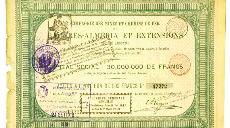 Acción de la sociedad belga Compagnie des mines et chemins de fer Bacares-Almería et extensions que explotó el coto minero