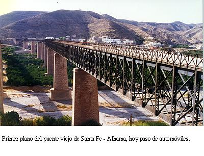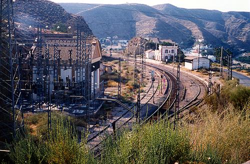 Muy ferroviaria estación de Santa Fe – Alhama, en curva entre un túnel y un viaducto. A la izquierda, nueva y antigua estaciones transformadoras. Entre esta estación y la de Gérgal funcionaron los primeros tractores eléctricos de España en 1911.