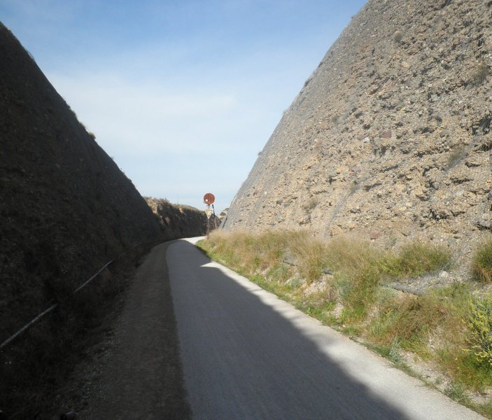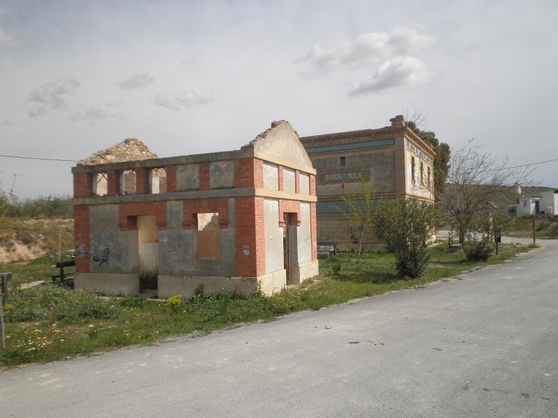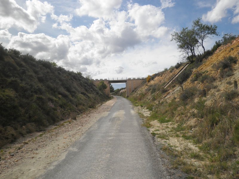 Alcanzamos el apeadero de El Niño justo por el antiguo paso a nivel del km. 45,923 para descansar en la zona que se ha habilitado junto al sencillo edificio. Aquí comienza un trayecto de gran belleza por la frondosa vegetación que nos rodea y donde nos encontraremos tres túneles, todos sin iluminar, antes de llegar al apartadero de La Luz, una estación de cruce de trenes, ya que no daba servicio a ninguna población y el trayecto entre Mula y Bullas, de 18 km., hacía aconsejable contar con un apartadero de estas características para facilitar la explotación ferroviaria. Especialmente dura es la rampa que nos espera a la salida de La Luz, hasta 20 milésimas, que concluirá en el punto más alto de la línea: la estación de Bullas. Así pues, encaramos la subida con ánimo, pero no podemos pasar de largo sin detenemos en un espectacular viaducto en curva de 8 arcos de 16 m. de luz que salva el barranco Azul. Otras obras que nos vamos encontrando por el recorrido son los pasos superiores para los caminos agrícolas.Al igual que sucedió en Mula, la traza original se pierde a la entrada de Bullas por culpa del progreso y, también, todo rastro de lo que fue su estación, cuyo edificio de viajeros era diferente al resto de los de la línea. Con una tercera planta abuhardillada, los pilares de ladrillo rematados en torres almenadas y la fachada revestida de piedra, parece ser que fue un homenaje de Manuel Bellido, el ingeniero de caminos autor del proyecto de la línea, al punto más elevado del trazado. Una pena que no haya subsistido. Esto nos obliga a adentrarnos en el pueblo, famoso por sus vinos, hacer una parada para reponer fuerzas y volver a cambiar una cámara, ya que el parche que anteriormente pusimos no parece haber sido efectivo. Aquí finaliza la jornada, ya que el incidente de Campos del Río nos hizo perder mucho tiempo y teníamos que volver a Espinardo en el mismo día. Así pues, pensando en terminar el recorrido en una nueva etapa, decidimos volver por nuestros pasos antes de que se hiciera de noche.