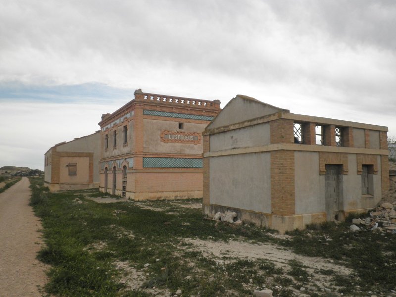 Salir de esta estación para volver otra vez a la traza nos obliga a pasar por una calle hasta llegar a unas escaleras para bajar hasta la carretera de Alguazas – Las Torres de Cotillas, ya que en este punto el ferrocarril la salvaba con un pontón de 5’5 m. de luz y que ha sido desmantelado. Pero, inmediatamente volvemos a tomar la explanación, que se ha convertido en un camino rural y que no se parece en nada con el firme existente entre Espinardo y las inmediaciones de Alguazas. Sin embargo, como son bicicletas de montaña, no hay ningún problema en seguir ascendiendo poco a poco, rodeados de plantaciones agrícolas, hasta llegar al apartadero de Los Rodeos. Ubicado en pleno campo, se conserva en estado deficiente el edificio de viajeros, los retretes y un muelle de mercancías. Esta estación, reconvertida en un simple apeadero, quedó solamente con la vía general, eliminando la de mercancías y la secundaria.