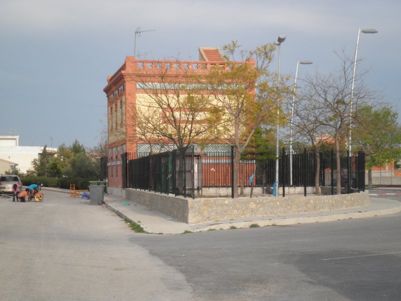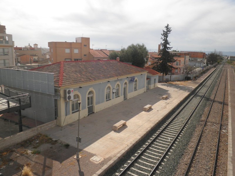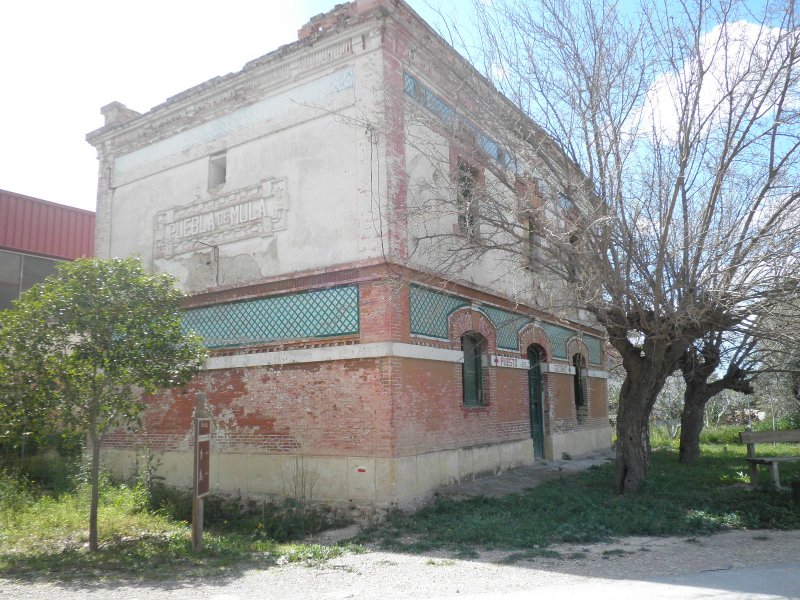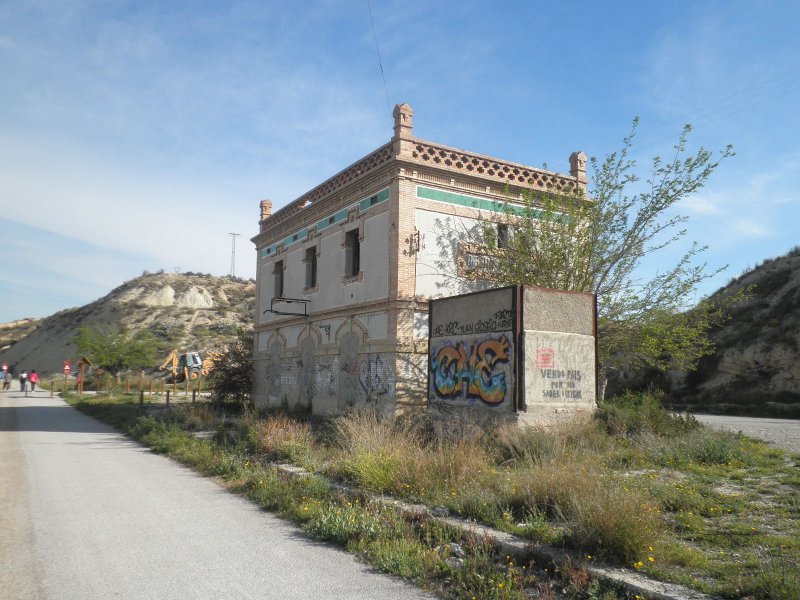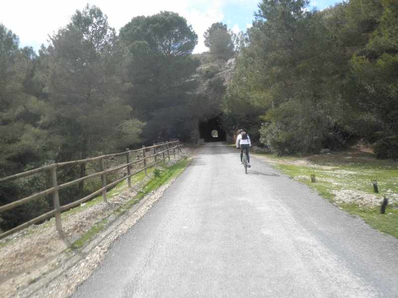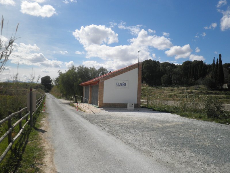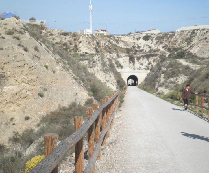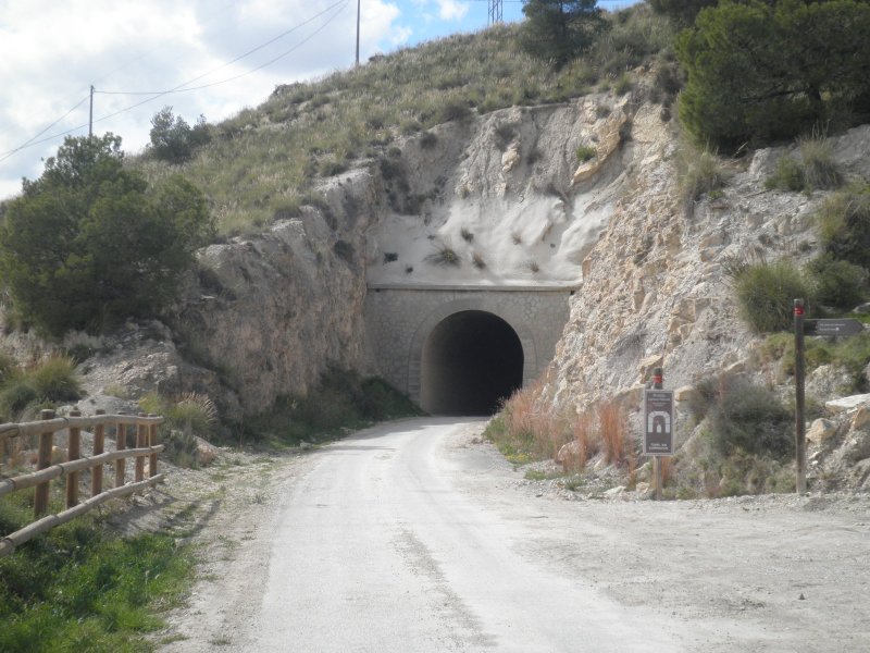 Dispuestas las bicicletas y sin tiempo de calentar los músculos, comenzamos a subir una rampa de 20 milésimas en un tramo de unos 3’5 km. con buen firme y que permite rodar bien, a pesar ser de subida. Este tramo es muy utilizado por vecinos de las urbanizaciones colindantes y por los estudiantes que acuden al centro universitario desde las localidades cercanas a la vía, aunque durante nuestro recorrido era periodo de vacaciones.Una señal avanzada (de lo poco, o casi nada, que queda de instalaciones fijas) nos anticipa la llegada a la estación de La Ribera, o Ribera de Molina, tal cual figura en el propio edificio de viajeros. En pleno descenso, alrededor de 2’5 km., nos encontramos con el primer túnel del recorrido (201 m.) y, enseguida, entramos en la estación. El edificio principal se encuentra deteriorado, con las puertas y ventanas tapiadas. El muelle de mercancías alberga un bar que tiene buena clientela, pero que en otra época tuvo una gran actividad propia para lo que fue creado. Todavía quedan los restos de los apoyos de unos silos de cemento que almacenaban el producto recibido en vagones tolva cuando estuvo funcionando solamente como ramal industrial.La cercanía a núcleos muy poblados anima a muchas personas a pasear con sus perros, corriendo o en bicicleta, disfrutando de una mañana de sábado primaveral. Ahora rodamos por un terreno prácticamente llano, incluso ligeramente descendente, que nos conducirá hasta la estación de Molina de Segura, no sin antes cruzar un paso a nivel con una carretera que todavía permite apreciar la vía semienterrada por el asfalto y, sobre todo, la casilla del paso, imagen inconfundible. Estos edificios estaban destinados a vivienda del personal de vías y obras y de la persona encargada de la guarda del paso a nivel, estando ubicados en las carreteras más importantes y en los pasos vigilados permanentemente.