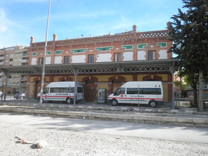 Continuamos para llegar a la estación de Molina, que sí conserva su característica marquesina, y hoy habitada por el servicio de la Cruz Roja, con sus vehículos estacionados en el andén, donde antes esperaban los viajeros la llegada y salida de los trenes. La actividad industrial y comercial de este municipio permitió que el ferrocarril siguiera prestando servicio de mercancías hasta finales de los años 80. De ello dan fe las naves que se encuentran junto a la vía y que en su día recibían los vagones hasta sus instalaciones. Así pues, seguimos la traza para detenernos en un paso a nivel y pulsar el botón para que se nos ponga la luz verde del semáforo y podamos pasar sin peligro.Pronto nos encontraremos con el único puente metálico de la línea, el que se alza sobre el río Segura, de 50 metros de luz, totalmente restaurado y adecuado a los nuevos usos de la traza ferroviaria. Antes de llegar a la estación de Alguazas hay un pequeño tramo, junto a unas instalaciones industriales, en muy mal estado, incluso nos podemos confundir de dirección, ya que no está bien señalizado. A pesar de ello, la intuición ferroviaria nos dice por dónde debería ir el trazado para llegar a lo que era una estación conjunta. Hoy, Alguazas-Molina, perteneciente a la línea Cartagena – Chinchilla, era donde se cruzaban esta línea y la Murcia – Caravaca. Se nota la importancia que tuvo este enclave por sus dimensiones y sus instalaciones. Sin embargo, hoy en día presenta un aspecto totalmente transformado, no solamente en el haz de vías, reducidas a tres, sino que el edificio de viajeros de MZA, reconvertido en sede de la policía local, lo han medio tapado con una desafortunada intervención: los muelles de mercancías han sido adaptados para albergue y zona de ocio, pero alterando totalmente su fisonomía, con muy mal gusto y sin ningún tipo de respeto por conservar la esencia de esos edificios. Nos consolaremos con que, al menos, no los han demolido y nos podemos imaginar cómo fue la vida ferroviaria en tiempos mejores. Lo único que medio se salva es un muelle de mercancías cubierto que queda en el lado de la línea que recorremos.