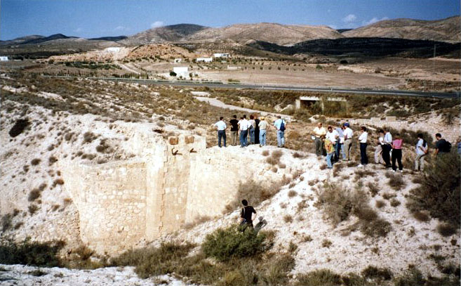 La interesante jornada concluyó con una breve parada, en el camino de regreso a Almería, junto al impresionante muro del llamado “Pantano de Isabel II”. Su construcción, según explicó el profesor Sánchez Picón, data de 1845 y se levantó con un sistema escalonado de sillería caliza de gran solidez. El objetivo de esta empresa, de iniciativa privada, era poner en regadío un amplio lote de tierras en el Campo de Níjar, pero esta finalidad fue irrealizable debido a la colmatación por lodos de la cuenca de recepción, ubicado en una confluencia de ramblas en la cerrada de los Gaitanes.