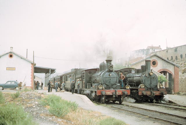 Dos locomotoras de vapor, las RENFE 130-2142 y la 040-2366 hacen parada en la estación de Serón.