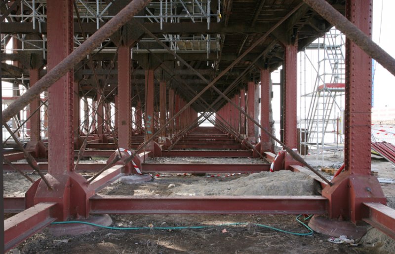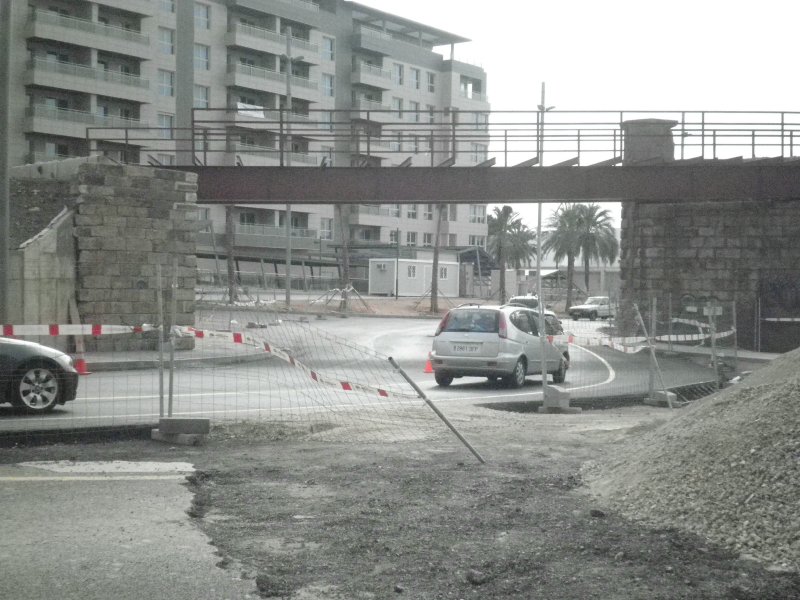 Otra actuación que se está terminando y que afecta a una parte de la rampa de acceso al cargadero, es una gran rotonda para distribuir el tráfico bajo las arcadas de piedra y que han obligado a modificar el primer pontón metálico (permitía el paso inferior del material rodante ferroviario a los antiguos Talleres Oliveros) y retranquear el estribo de apoyo, lado estación, para ampliar la luz y facilitar el paso de los vehículos una vez quede abierta al tráfico la referida rotonda. Para ello, se tuvo que desmontar piedra a piedra el estribo y, una vez terminado el nuevo emplazamiento, volver a colocarla tal cual estaba, al igual que el tramo metálico que reproduce el anterior retirado, pero más largo. Aunque todavía no está finalizada esta obra, esperamos que el resultado sea favorable al embellecimiento de todo el conjunto del embarcadero de la antigua compañía Alquife Mines.
