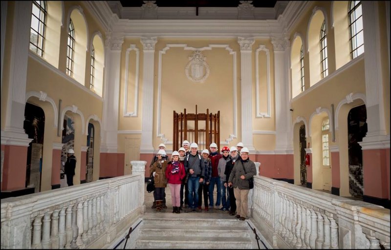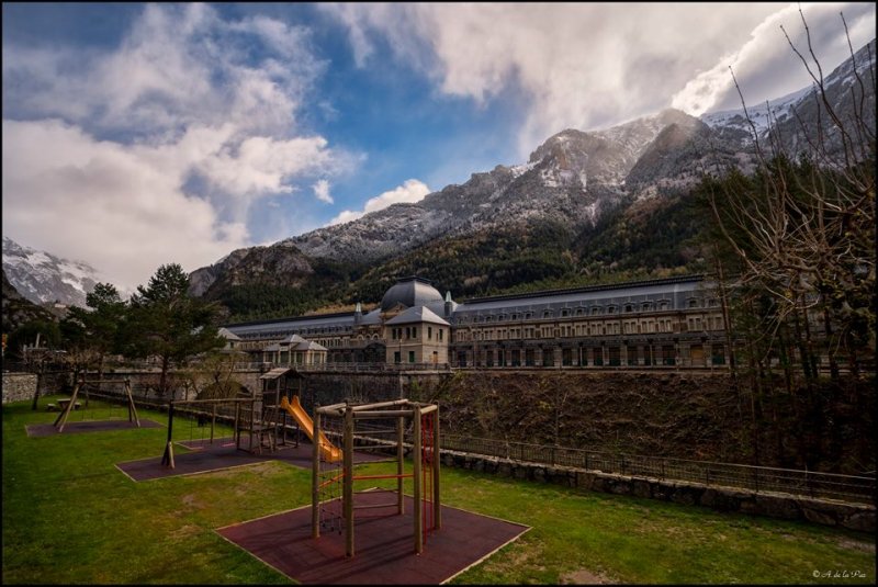 Llegamos a la estación de Canfranc a media mañana. La temperatura era muy fría, especialmente para un grupo de sureños como nosotros depositados a casi a 1200 metros de altitud con una borrasca amenazante empezando a dejar señales. Tras un reparador desayuno, empezamos a reconocer el terreno de la mano de Alejandro De la Paz, nuestro compañero experto conocedor de todo el entramado de Canfranc y especialmente, de su historia . Previamente habíamos visitado la oficina de turismo para recoger alguna documentación con el fin de realizar la visita guiada. Fue algo muy curioso cómo la guía nos contó que hace unos 40 años, varias familias provenientes de la almeriense comarca del mármol decidieron irse hasta Canfranc para explotar unas canteras de mármol negro.