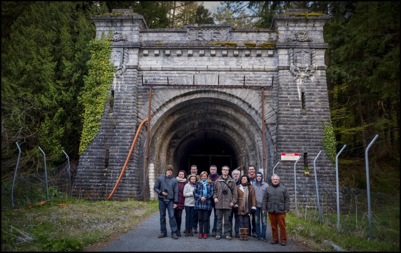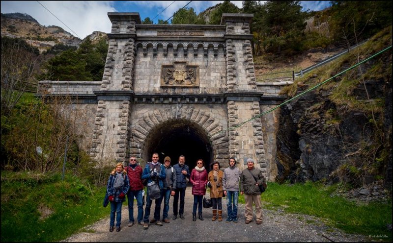 Continuamos paseando un rato más pese al frío y el aguacero que empezaba a hacer acto de presencia. Las cumbres cercanas aparecían nevadas y la ventisca arrojaba nieve granulada sobre nuestras cabezas. Bunkers, gigantescos hangares, vagones, coches, grúas y una enorme placa giratoria eran los vestigios más llamativos. Todo se construyó de acuerdo al mastodóntico tamaño del edificio y se preparó para ofrecer una gran cantidad de servicios de todo tipo. Hoy día, impone el silencio reinante en todo el recinto junto con su aire de decaimiento y abandono. La comida tuvo lugar en el restaurante del antiguo hotel Ara, donde se alojaban los camioneros suizos que transportaban el famoso oro por carretera. Después de comer asistimos a una visita guiada a las instalaciones partiendo del vestíbulo principal del edificio. Conocimos un poco mejor la historia a través de la guía local y de los videos donde supervivientes explicaban sus experiencias. Finalizada la visita, realizamos un pequeño recorrido en el “canfranero” de la tarde para llegar hasta Jaca para conocer la estación y, sin apenas tiempo, volvimos a subir al tren que nos devolvería a Canfranc. Finalmente, visitamos también la boca “española” del túnel de Somport cuyo acceso está prohibido ya que, actualmente, es la sede de un renombrado laboratorio científico.
