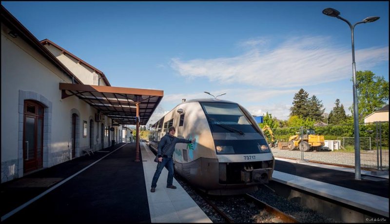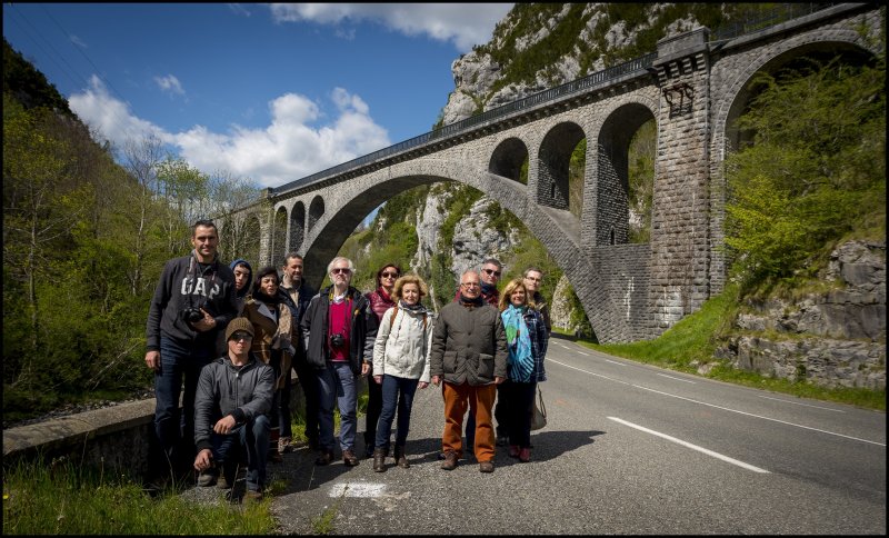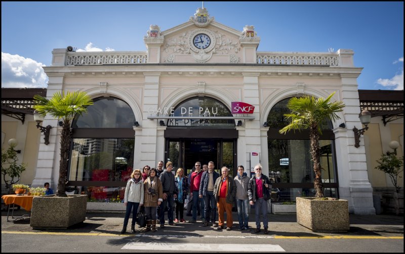 Una vez llegados a la estación de Paul en coche y con la decepción de no haber podido subir a la ciudad en el esplendoroso funicular (estaba fuera de servicio), dimos un paseo hasta el centro histórico donde los manifestantes del primero de mayo recogían sus bártulos y nos sirvieron de guías. Comimos en la zona centro y regresamos a la estación para, esta vez sí, volver en tren y sin contratiempos que reseñar. Una vez reagrupados en Oloron y ya solo a bordo de los dos coches, iniciamos el regreso haciendo paradas continuas para examinar diversos puntos de interés de la línea que Alejandro había señalado, con atención especial al tramo entre Oloron y Bedous, totalmente renovado para su reapertura el 26 de junio de este año. Pudimos comprobar con alegría que sí es posible que en un futuro no muy lejano se vuelva a poder viajar en tren entre España y Francia por Canfranc.