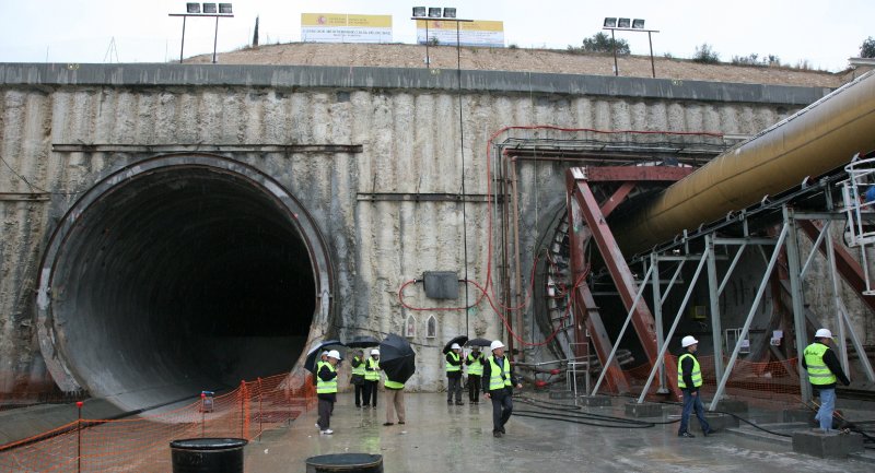 Posteriormente, a pesar de la persistente lluvia, se realizó una visita a los distintos tramos y a sus elementos constructivos más significativos, como el viaducto en arco del río Jauto (Los Gallardos – Sorbas); el túnel artificial del tramo Vera – Los Gallardos; y un recorrido final por las instalaciones de la boca norte de los túneles de 7’5 km. de longitud en el tramo Sorbas – barranco de Gafarillos, de los cuales, ya se han perforado 3’5 km. del tubo número dos. Como dato curioso, por la coincidencia de la toponimia, la tuneladora que realiza los trabajos en este punto viene de horadar el túnel de La Cabrera de la línea Madrid – Valencia, donde obtuvo un record de metros excavados por día y, ahora, se encuentra en Sierra Cabrera avanzando a un ritmo muy superior al esperado. Finalmente, en la embocadura del tubo número uno, que se encuentra preparado para recibir a la gran tuneladora una vez que finalice la excavación de su gemelo, el grupo de amigos del ferrocarril posó para la posteridad.