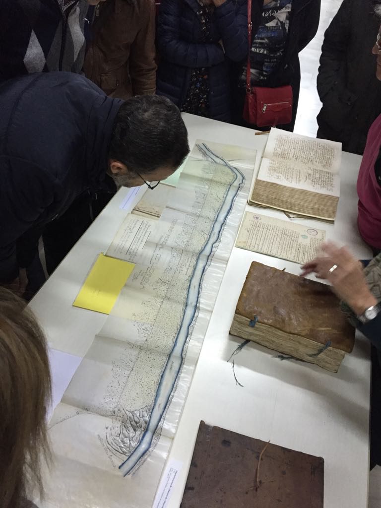Tras las explicaciones y responder a las preguntas de los asistentes, se hizo un recorrido por las distintas dependencias del AHPA para finalizar con una muestra de una serie de documentos de gran valor y de distintas épocas (desde 1519 hasta el siglo XX) que conservan en esta institución. De gran interés para nuestros asociados fue el expediente de expropiación de terrenos para la construcción del ferrocarril de Lucainena de las Torres a Aguamarga por la Compañía Minera de Sierra Alhamilla, que data de 1891, con una planimetría excepcional.